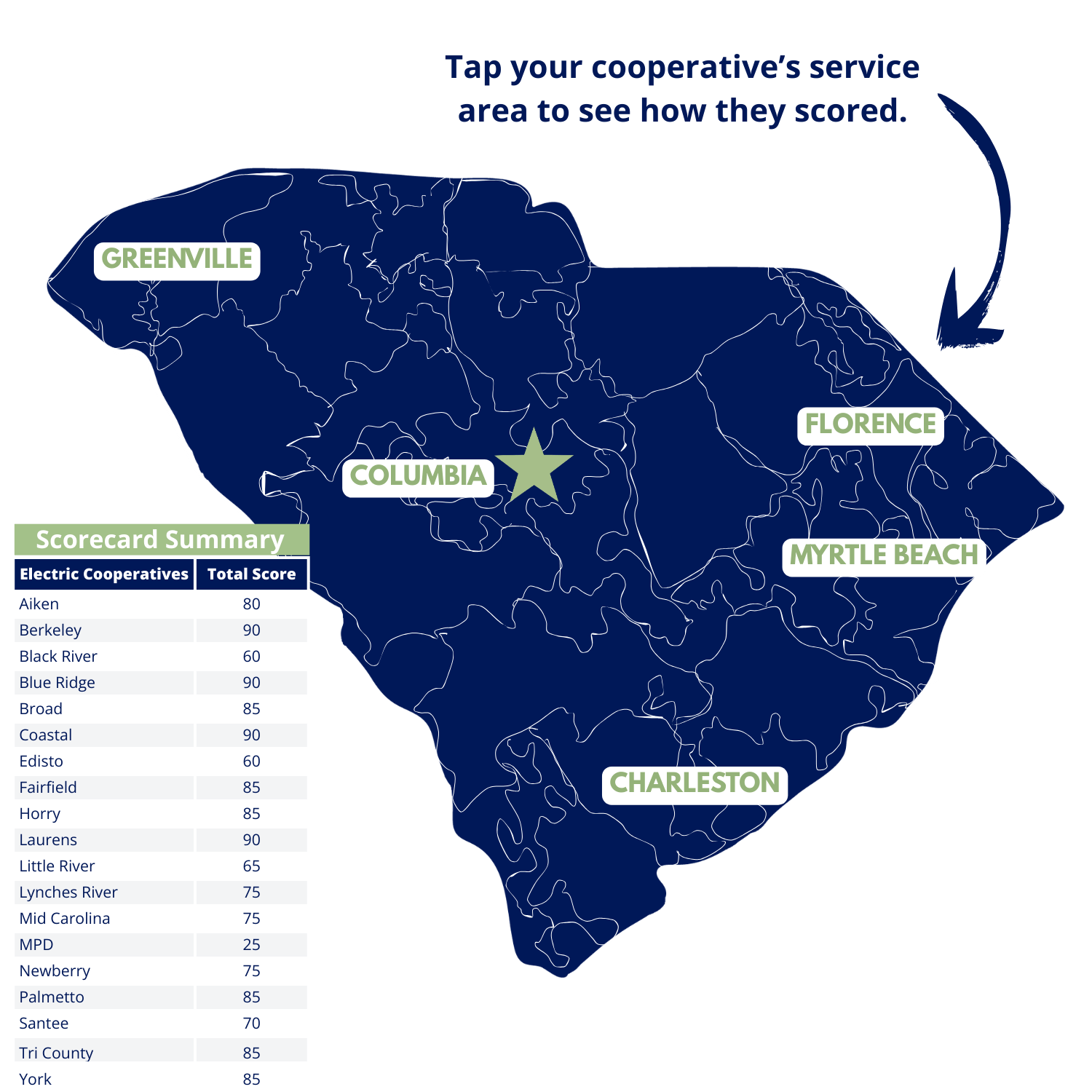 In the spring of 2025, SCECEP evaluated 19 electric cooperatives across South Carolina on 10 core governance and clean energy metrics. Each cooperative was scored out of a total of 100 points. Metrics assessed include board transparency, member-owner access to decision-making, rate transparency, energy efficiency programs, and access to clean energy programs.